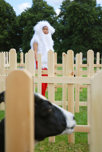 Following A Sheep, 2009 Live performance ‘Following A Sheep’ marked the first time that Milee the Sheep had interacted with live animals in her work. Following A Sheep saw Milee mimic the actions of two Jacob sheep over a duration of two days. Jacob sheep date back to the biblical era, their horns and the spotty coats can cause people to mistake them for goats. The appearance of the sheep questions peoples common conceptions of what typical sheep look like, raising notions of species and evolution. Part of the Shift-Time Festival in Shrewsbury to cerebrate the Darwin’s 200 years birthday. Commissioned by Shropshire County Council.