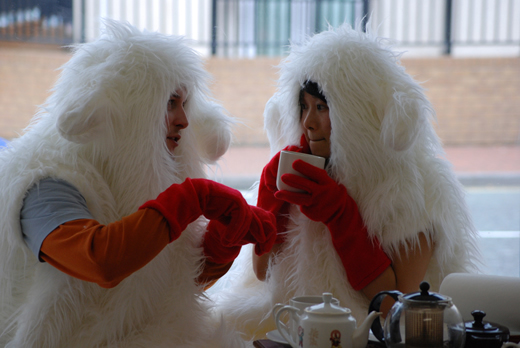 The shop front display window space was especially chosen to develop this site-specific performance. ‘Tea Time’ is a piece where Milee The Sheep invites the audience to join her for a cup of tea in her one-piece jointed costume. This attempts to blur the boundaries and the forced communication between the performer and the audience where the tension and the action was lead by both parties.